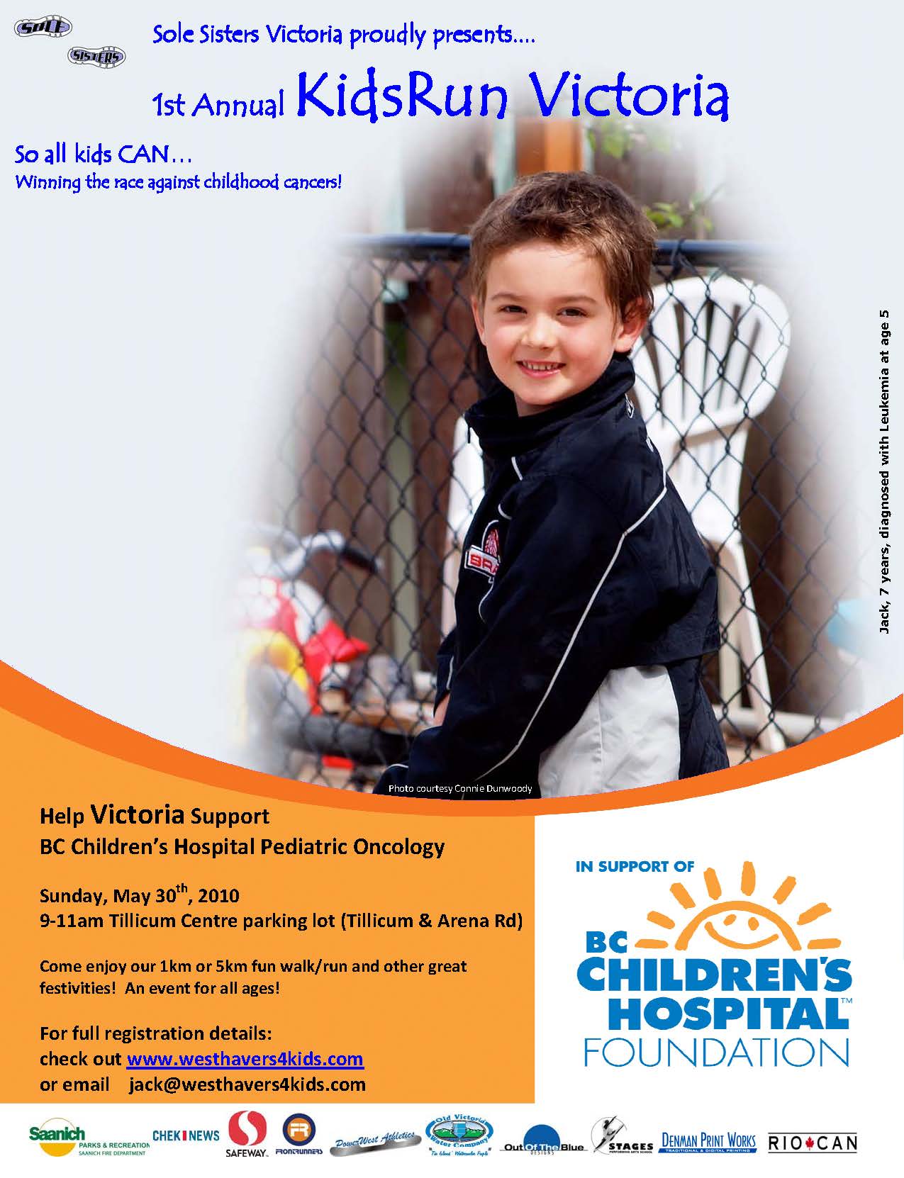 KidsRun Victoria is put on for our community by a group of eager volunteers. Sole Sisters Victoria has partnered again this year with the Saanich Fire Fighters Charitable Foundation with a goal to raise awareness of childhood cancers to support Pediatric Oncology for Vancouver Island’s Kids! Through research funding, social support and ongoing education, we CAN make a difference!
